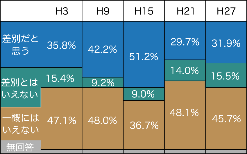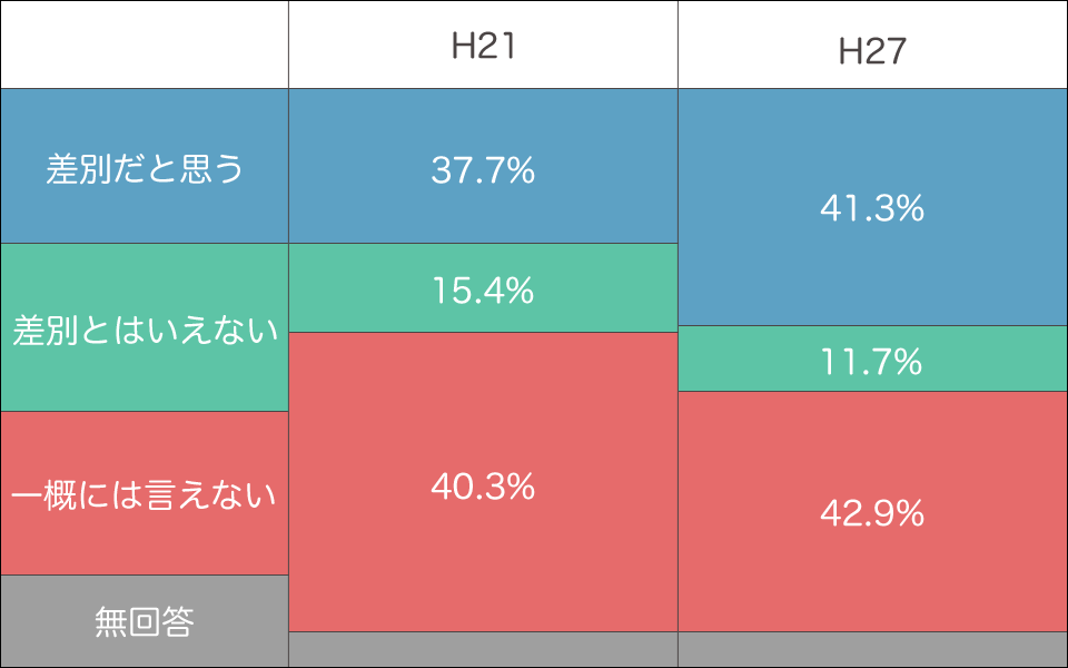 平成27年度調査において、「差別である」と考えている業者が約3割に対し、「差別ではない」又は「一概には言えない」と考えている業者は約6割います。